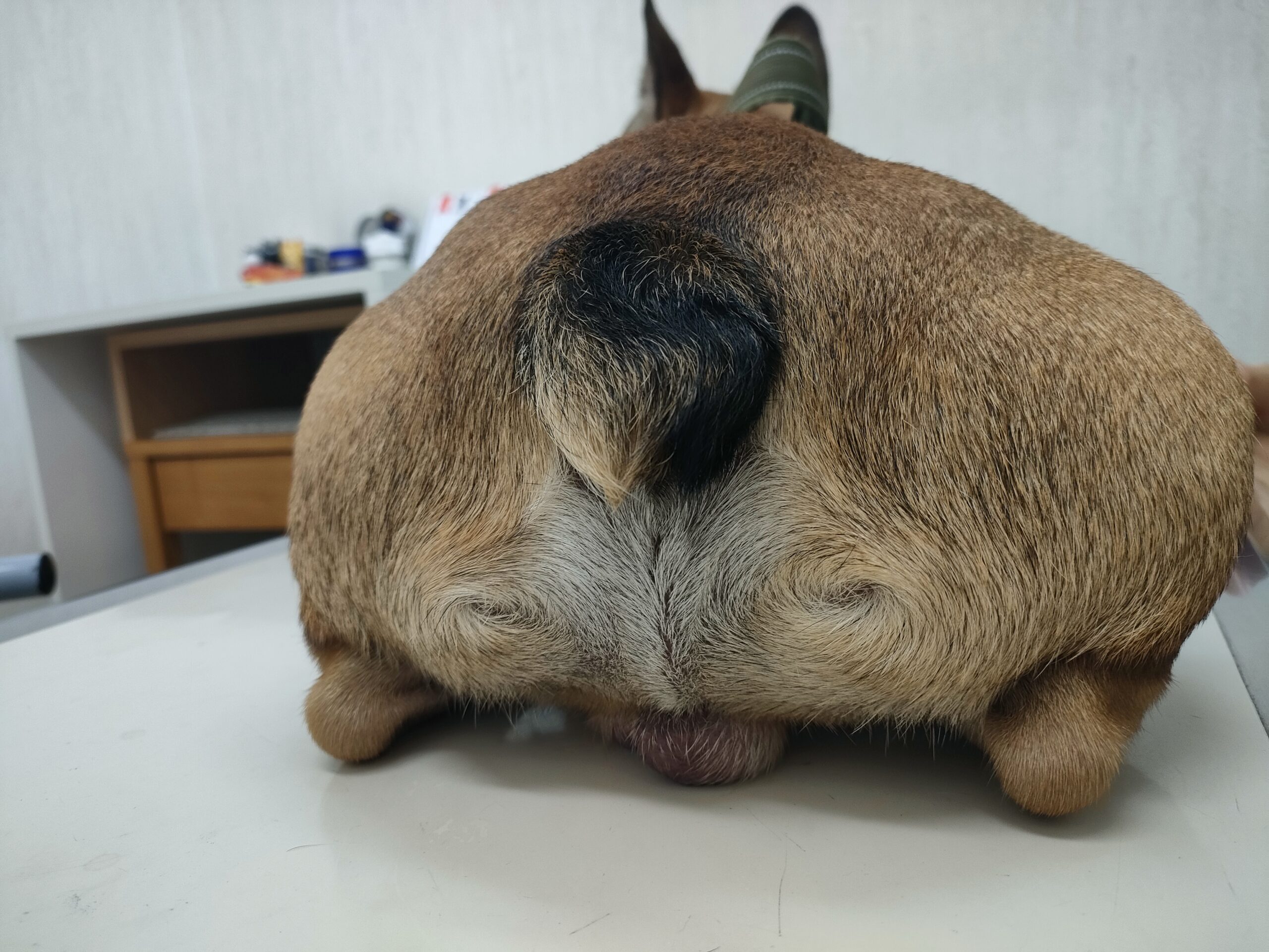 再検査のため来院。そしてレントゲンを撮り、確認してみると……「まだ残っとる!!」。また排泄を促す点滴を打つことに……。この点滴は皮下点滴なので犬がブヨブヨになります。